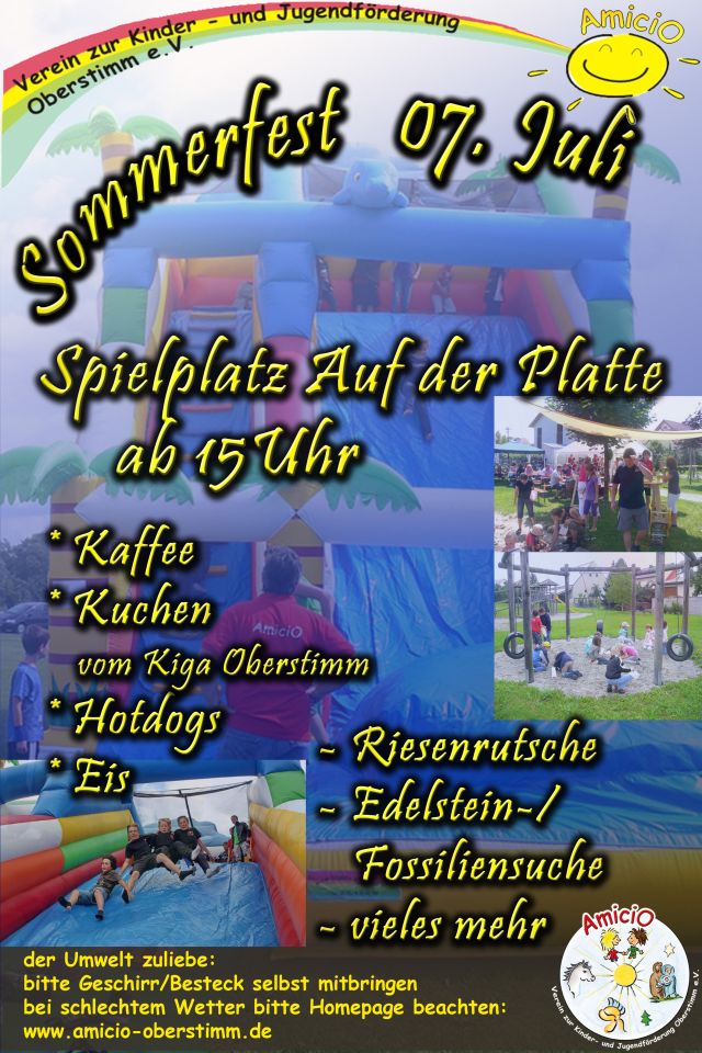 Haltet Euch den Samstag, den 07. Juli 2012 schon mal frei. Denn dann startet ab 15.00 Uhr wieder das AmiciO-Sommerfest. Dieses mal findet es am Spielplatz an der Platte statt. Was Euch da so alles erwartet, könnt Ihr schon mal dem Sommerfestplakat entnehmen.