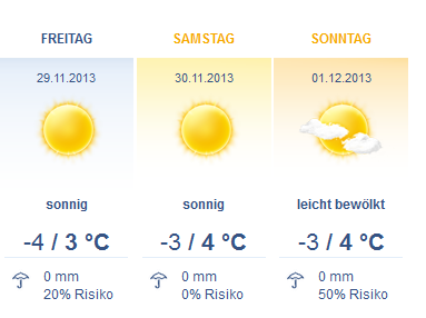 Die Wetteraussichten für das Christkindlmarktwochenende sind derzeit ganz gut. Sonnig, aber der Jahreszeit entsprechend schon ziemlich kühl – und vielleicht verliert sich ja doch noch die ein oder andere Schneeflocke auf unserem Christkindlmarkt.