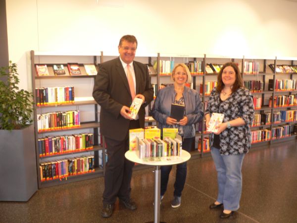 Zur großen Freude von Bürgermeister Herbert Nerb und Bibliotheksleiterin Melanie Graf überbrachte die 1. Vorsitzende Claudia Heidrich im Namen von AmiciO eine Spende in Höhe von 600 EUR.