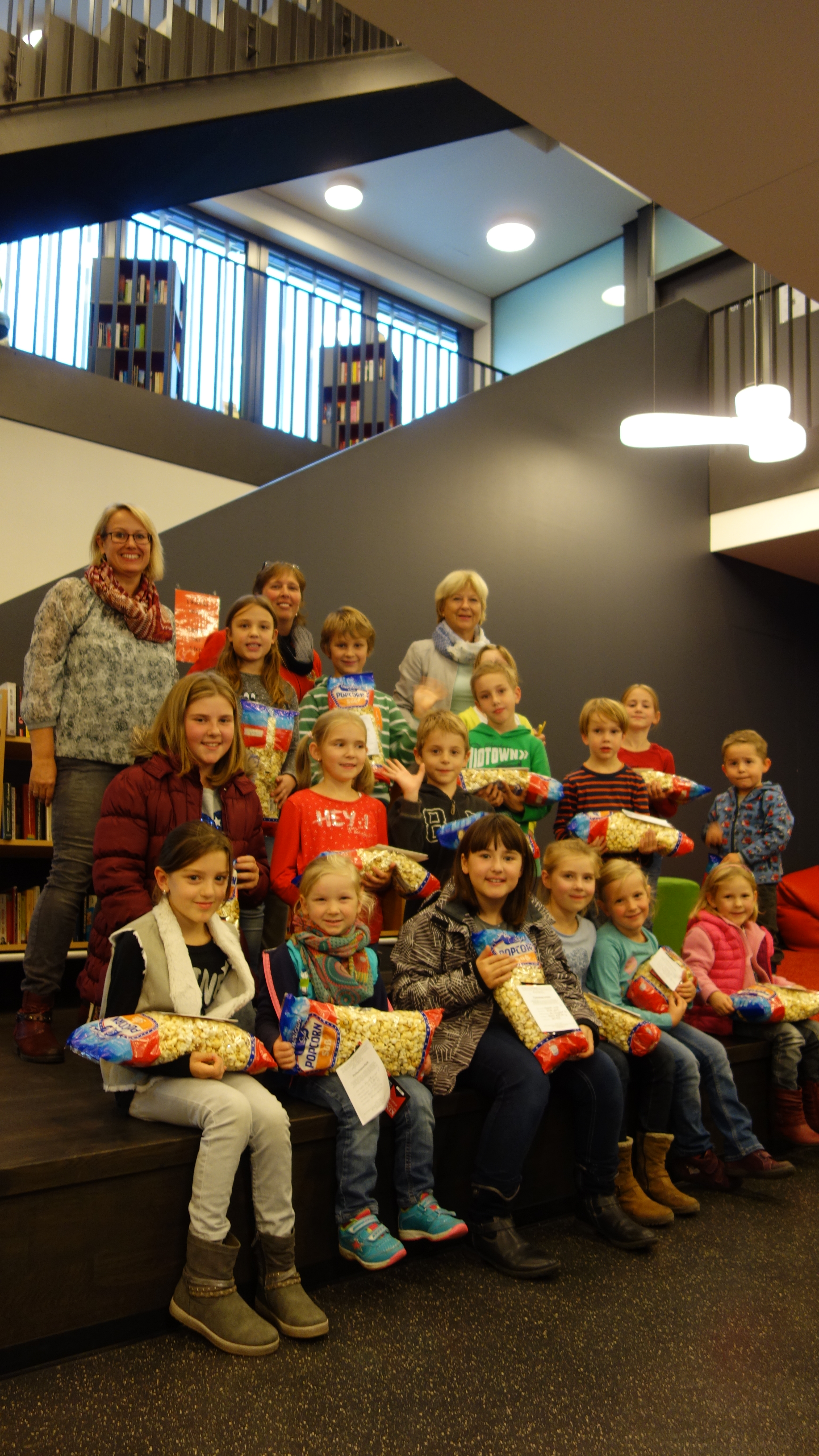 Unter allen abgegeben Ferienpässen wurden dabei Kinokarten im Wert von 150 Euro verlost. Die Kinokarten wurden von AmiciO für die Preisträger gesponsert. Unser Bild zeigt die glücklichen Gewinner mit einem Teil des Organisationsteams bei der Übergabe in der Bibliothek Manching.