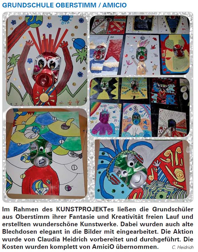 Im Rahmen des Kunstprojekts „Dosenmonster“ ließen die Grundschulkinder aus Oberstimm einen ganzen Vormittag ihrer Fantasie und Kreativität freien Lauf. Dabei wurden alte Blechdosen geschickt in die Bilder mit eingearbeitet. Acrylfarben, verschiedene Papiere, Klebestreifen, Kronkorken, Schere, Pinsel und Kleber setzten die kleinen Künstler zur Gestaltung ihrer farbenprächtigen Kunstwerke ein. Die Aktion wurde von Frau Claudia Heidrich in Zusammenarbeit mit Lehrkräften vorbereitet und durchgeführt.