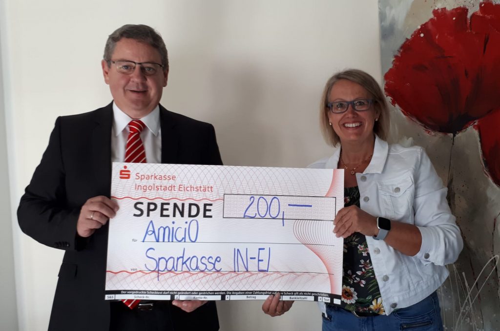 AmiciO freut sich über eine Spende der Sparkasse Ingolstadt Eichstätt übergeben durch Herrn Martin Heilmeier (Geschäftsstellenleiter der Sparkasse Manching) an die Vorsitzende Claudia Heidrich.