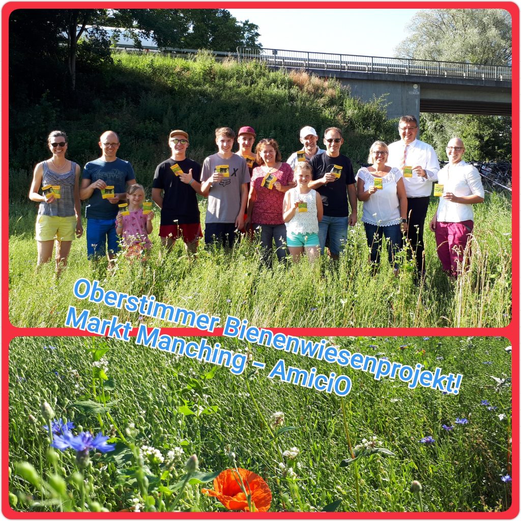 Im Frühjahr dieses Jahres begannen die Vorbereitungen für diese Bienenwiese. Die Idee reifte aber im Verein schon viel früher bei einem AmiciO Projekt für Kinder. Nach der erfolgreichen Suche nach einem geeigneten Grundstück starteten die Vorsitzende Claudia Heidrich und Bürgermeister Herbert Nerb das 300 qm Projekt. Mit Hilfe eines Experten und eigenen Recherchen wurde der Wiesensamen bei einer Spezialfirma bestellt. Die Kosten übernahm die Gemeinde. Nach einem Helferaufruf im Manchinger Anzeiger meldeten sich 17 Teilnehmer. Von der Bodenbearbeitung bis zur Aussaat waren 80 Arbeitsstunden nötig. Danke an die fleißigen Helfer. Das günstige Wetter bei der Ansaat führte zu einem üppigen Ergebnis. Es wird sich aber erst in den nächsten Jahren zeigen, ob es funktioniert und ein natürlicher Kreislauf in Gang kommt.