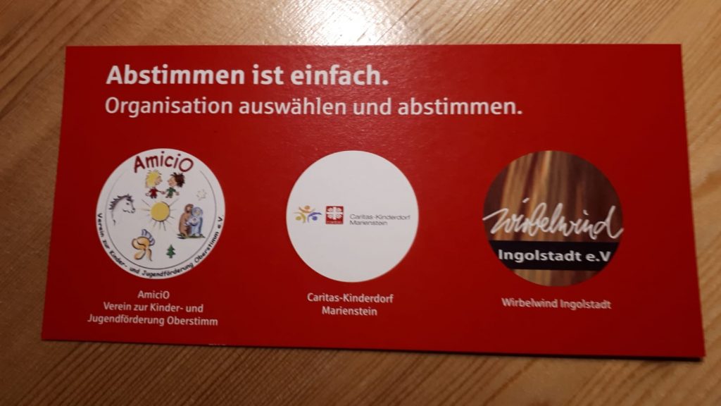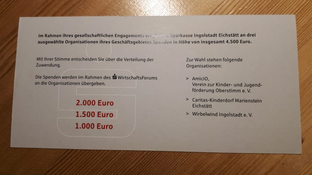 Wir sind unglaublich stolz, daß wir von der Sparkasse Ingolstadt Eichstädt für unser ehrenamtliches Engagement gewürdigt werden. Gemeinsam mit zwei weiteren Organisationen stehen wir beim Wirtschaftsforum der Sparkasse Ingolstadt Eichstätt am 19.11.2019 zur Wahl. Die Organisation mit den meisten Stimmen bekommt 2.000 EUR zur Unterstützung Ihrer Arbeit. Drückt uns die Daumen !!!