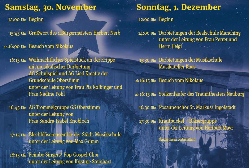 Der geschätzte Besucher darf sich sicher sein, dass nicht nur für den Gaumen viel geboten wird. Das musikalische Programm, das an beiden Tagen auf der Bühne dargeboten wird, reicht vom Kinderchor und einem weihnachtlichen Spielstück der Grundschule Ober-stimm bis hin zum feierlichen Posaunenchor. Ein breiter musikalischer Reigen wird gespannt und es dürfte somit für jeden Geschmack etwas dabei sein.Mit Hilfe der weihnachtlichen Musik und der Stelzenläufer vom Traumtheater Neuburg wird die Einstimmung auf die schönste Zeit des Jahres gewiss nicht auf sich warten lassen.