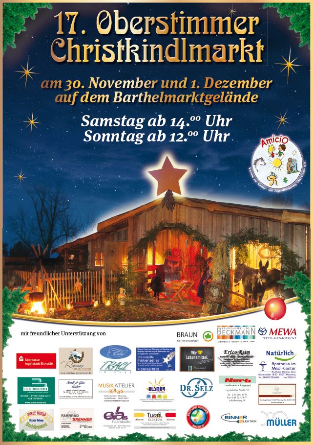 Am ersten Adventswochenende (30.11./01.12.2019) findet der inzwischen über alle Ortsgrenzen hinaus beliebte Christkindlmarkt mit seiner „lebenden Krippe“ in Oberstimm statt.
