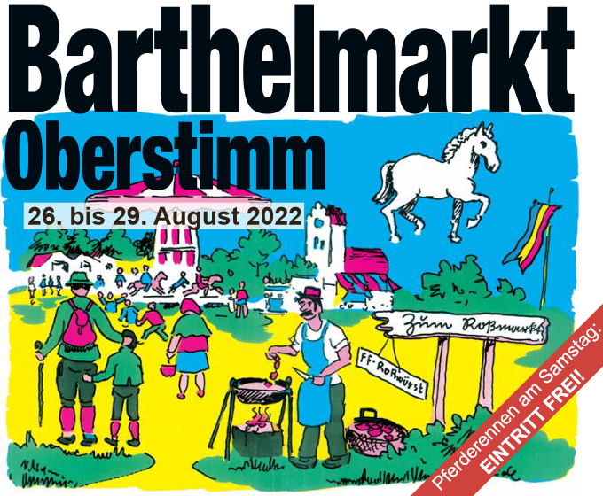 Am Freitag, den 26. August wird mit einer zünftigen Bierprobe und dem Festzug der Vereine der Barthelmarkt eröffnet. Um 14:00 Uhr ist Abmarsch an der Oberstimmer Kirche in Richtung Festplatz.