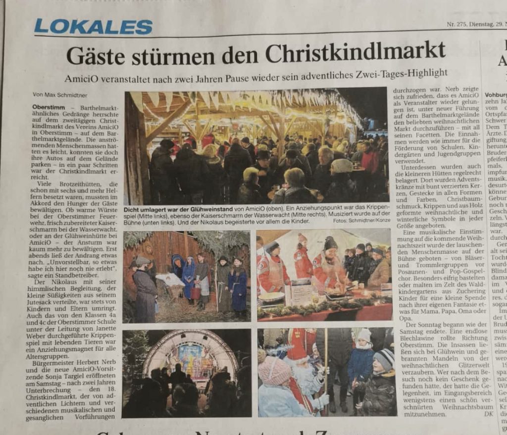 Bürgermeister Herbert Nerb und die neue AmiciO-Vorsitzende Sonja Targiel eröffneten am Samstag – nach zwei Jahren Unterbrechung – den 18. Christkindlmarkt, der von adventlichen Lichtern und verschiedenen musikalischen und gesanglichen Vorführungen durchzogen war. Nerb zeigte sich zufrieden, dass es AmiciO als Veranstalter wieder gelungen ist, unter neuer Führung auf dem Barthelmarktgelände den beliebten weihnachtlichen Markt durchzuführen – mit all seinen Facetten. Die Einnahmen werden wie immer für die Förderung von Schulen, Kindergärten und Jugendgruppen verwendet.