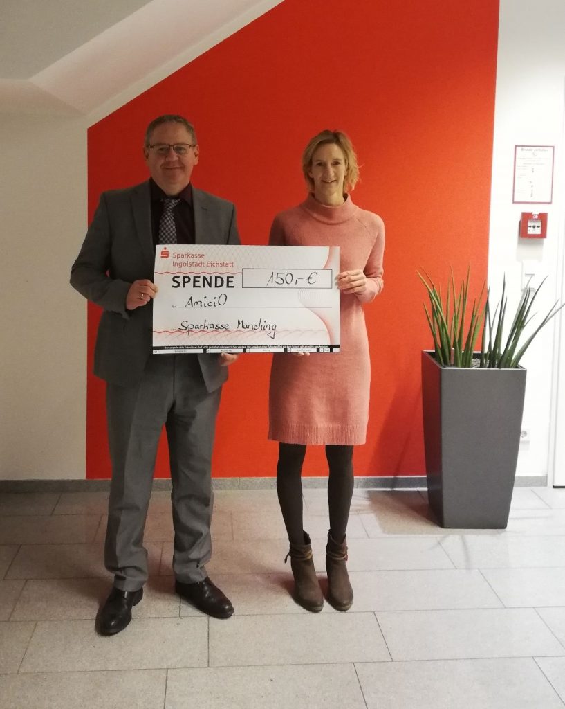Zum Jahreswechsel freuen wir uns über eine Spende der Sparkasse Ingolstadt Eichstätt in Höhe von 150 Euro an AmiciO zur Förderung der Kinder- und Jugendarbeit. Die Spende wurde vom Geschäftsstellenleiter der Geschäftsstelle Manching Herrn Martin Heilmeier an die 1. Vorsitzende von AmiciO Sonja Targiel überreicht.