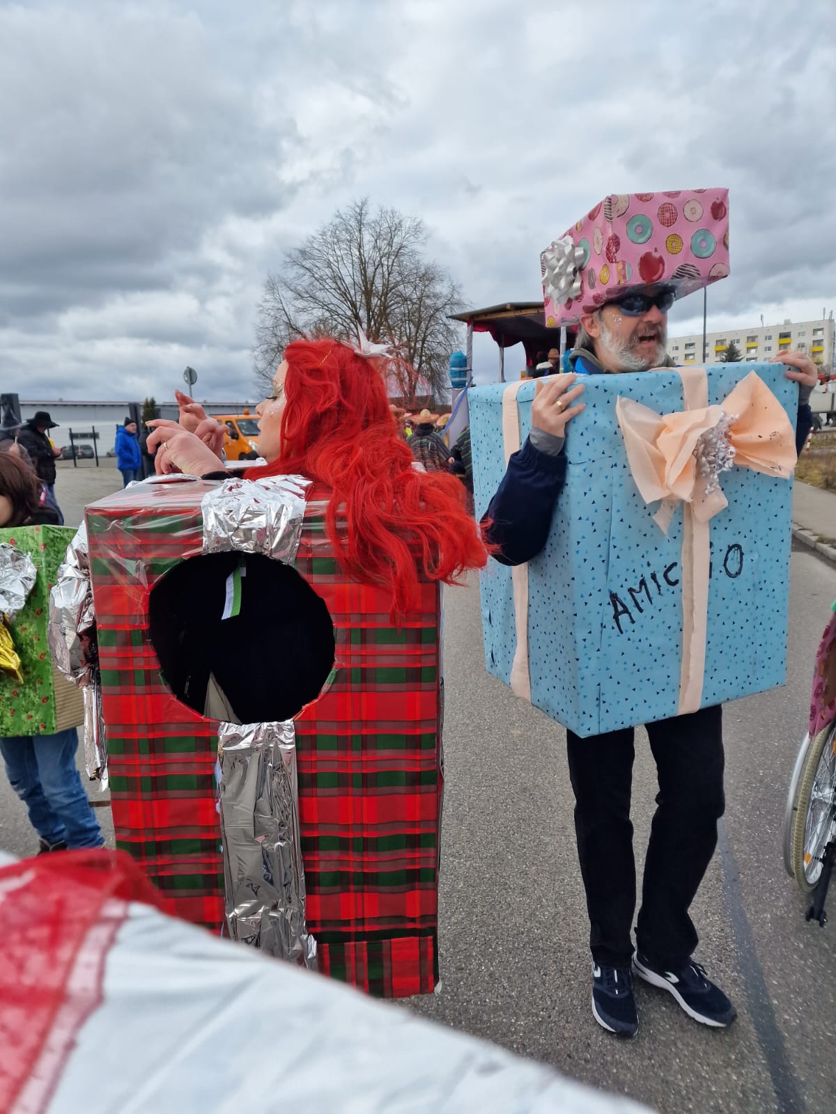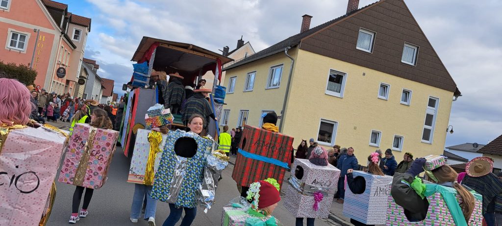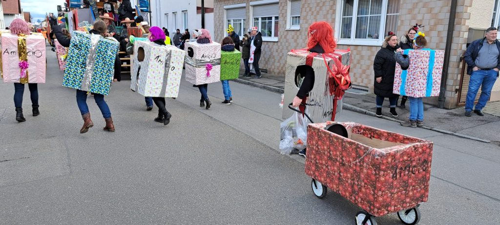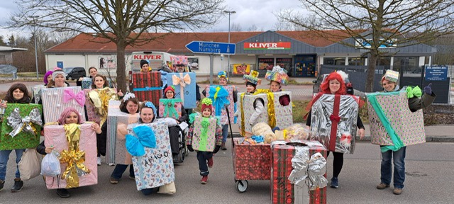 Am Faschingssonntag fand in Manching der traditionelle Faschingsumzug statt. Mit dabei waren rund 700 Teilnehmerinnen und Teilnehmer mit 20 aufwändig gebauten Wagen sowie zwölf Fußgruppen. Auch AmiciO beteiligte sich nach der unfreiwilligen Coronapause mit einer Fußgruppe in aufwendigen und farbenfrohen Geschenk-Kostümen an der diesjährigen Faschingsgaudi. Diese wurden im Vorfeld in zahlreichen Bastelsessions gemeinsam erarbeitet und von den tausenden Zuschauern am Strassenrand bestaunt und bejubelt.